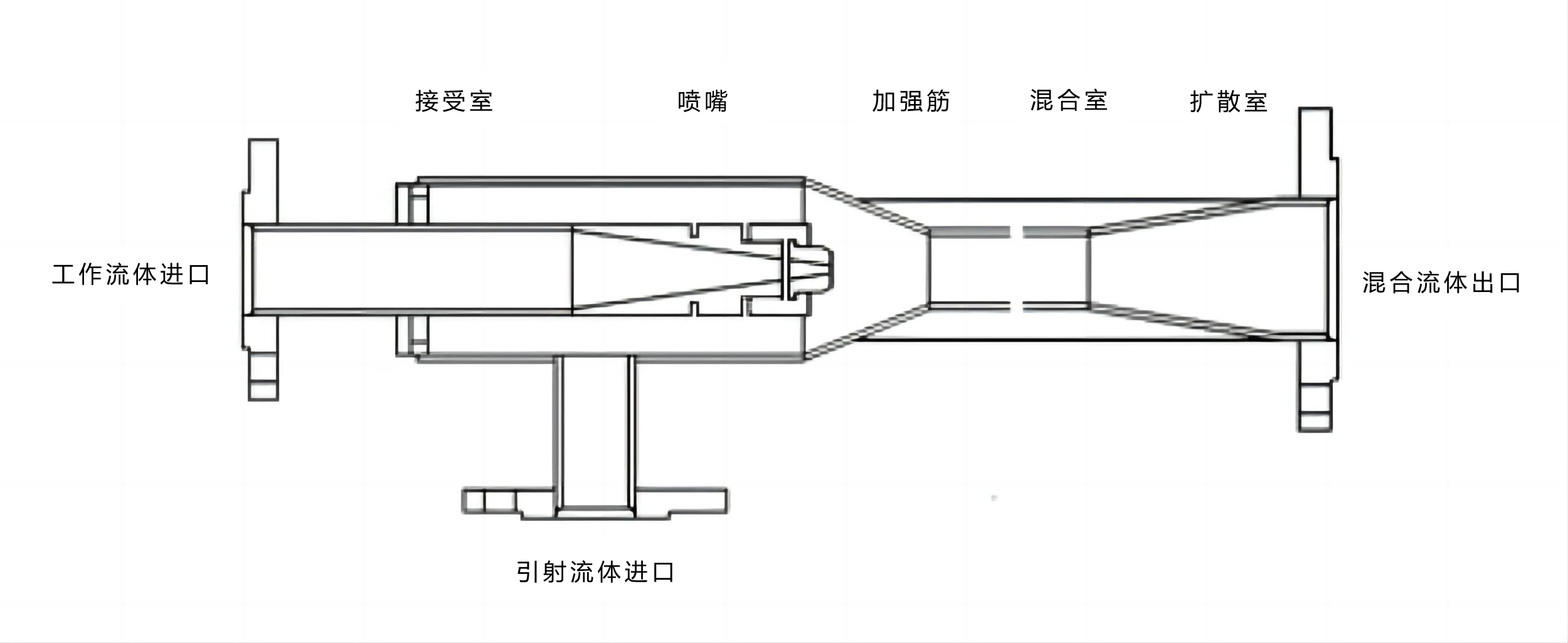 | 標準的噴射混合器由接受室、噴嘴、混合室、擴散室組成。 |